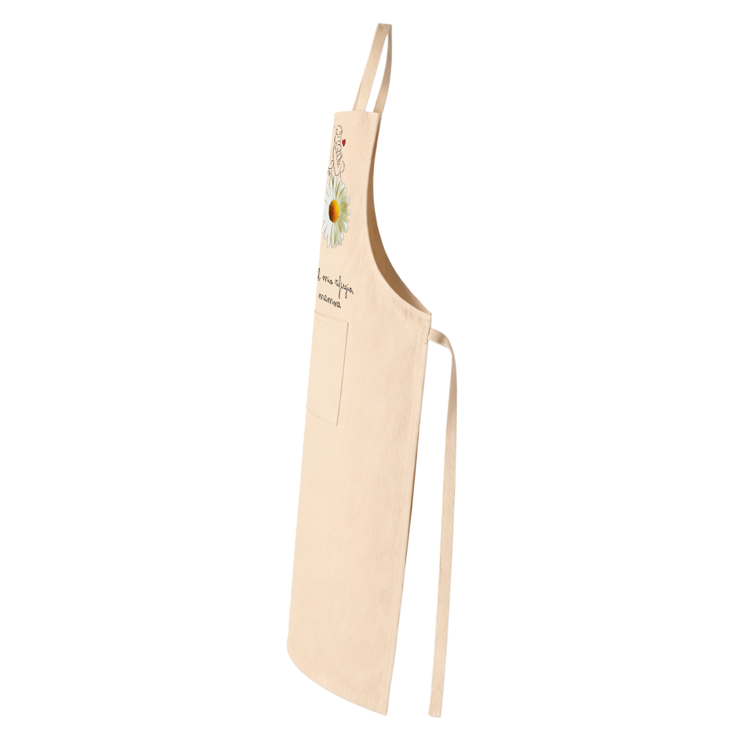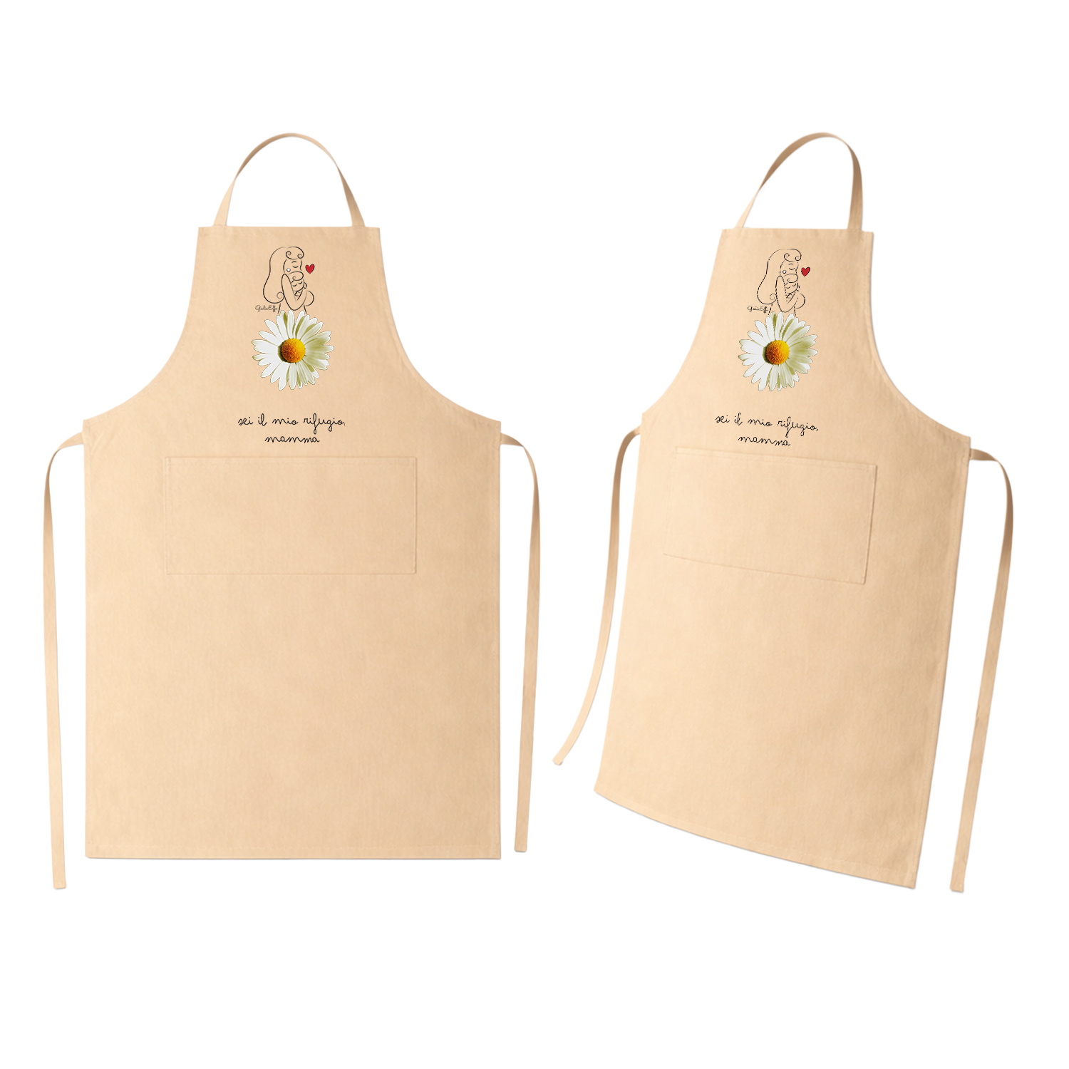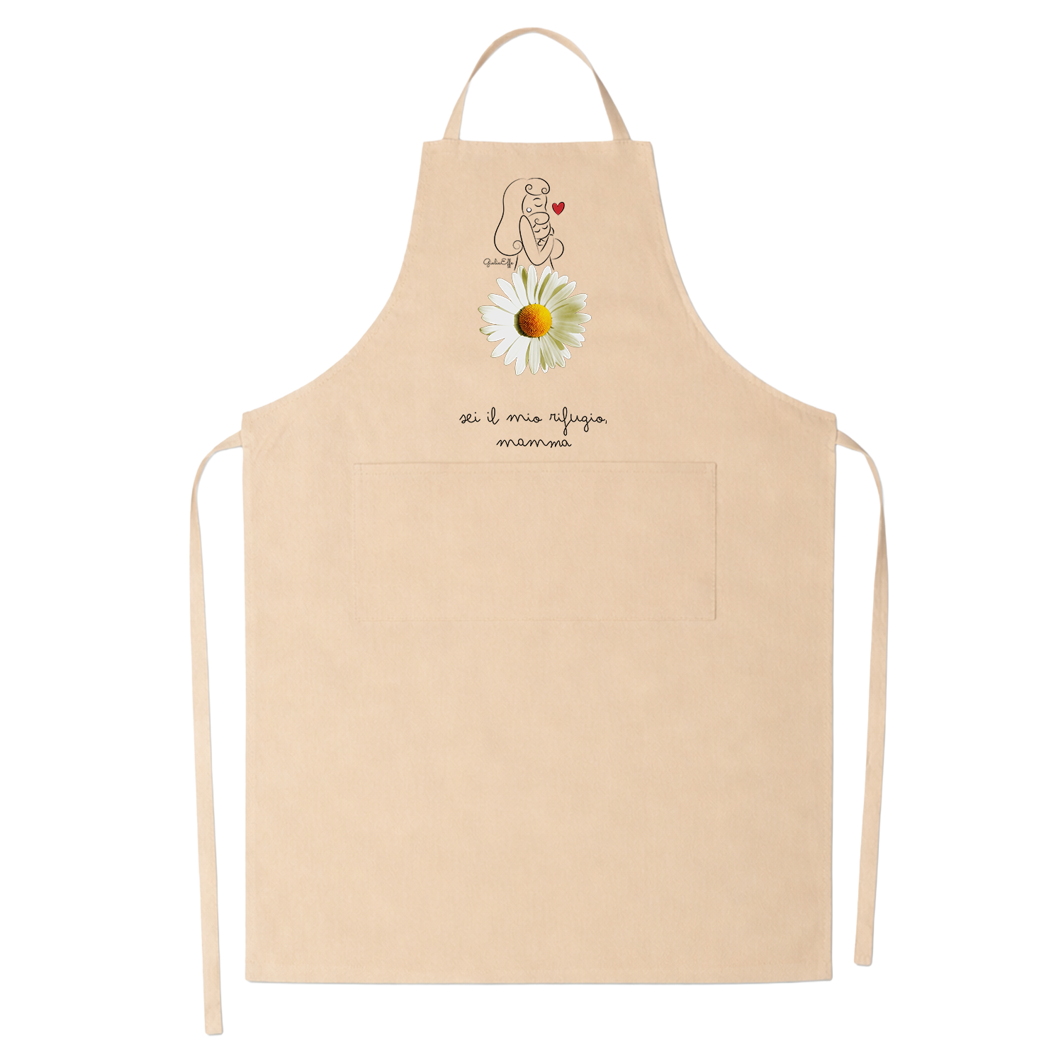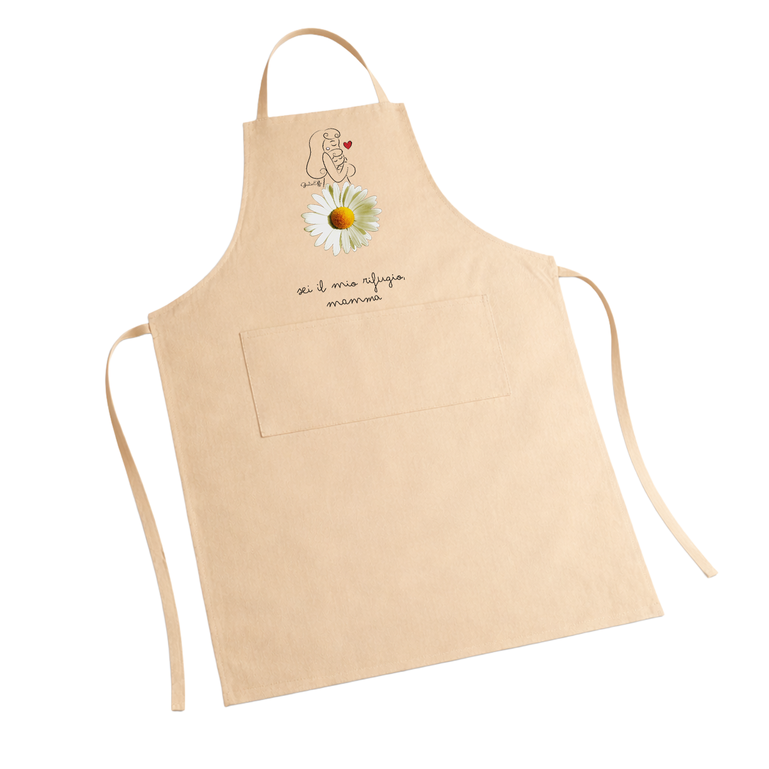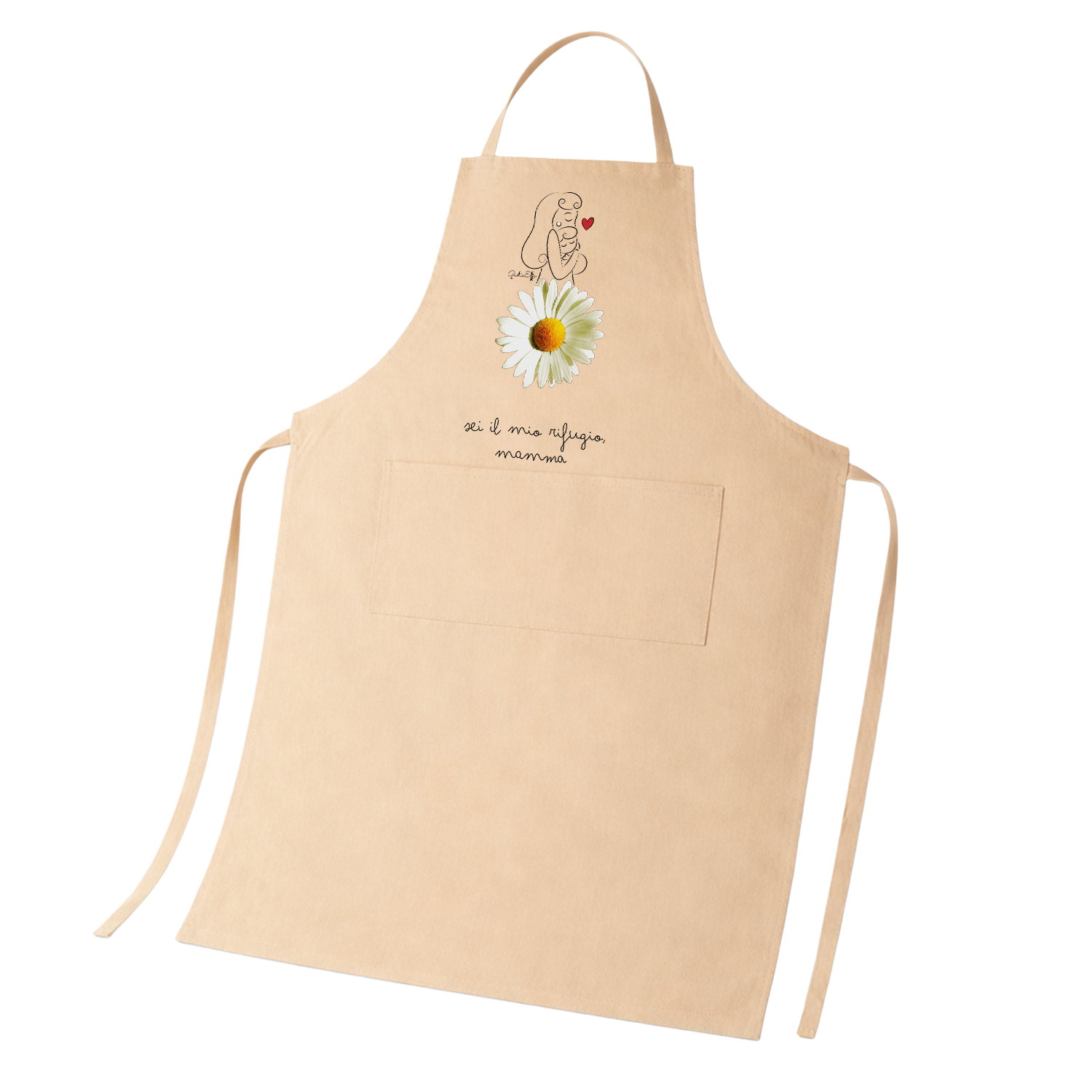 Questo grembiule nasce per celebrare il legame più forte di tutti: quello con la mamma. Il design delicato con l’illustrazione stilizzata e la margherita simbolo di purezza e amore, accompagnato dalla frase “Sei il mio rifugio, mamma”, lo rende un regalo emozionale e autentico.